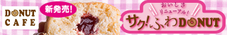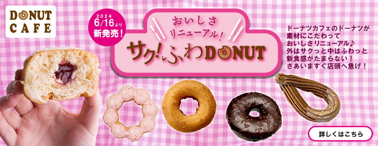 リニューアル最大の特徴の「サク!ふわ」食感をタイトル文字とドーナツの断面画像でインパクトを与える。ピンクのギンガムチェックは楽しいピクニックでドーナツを食べるイメージを表現。
