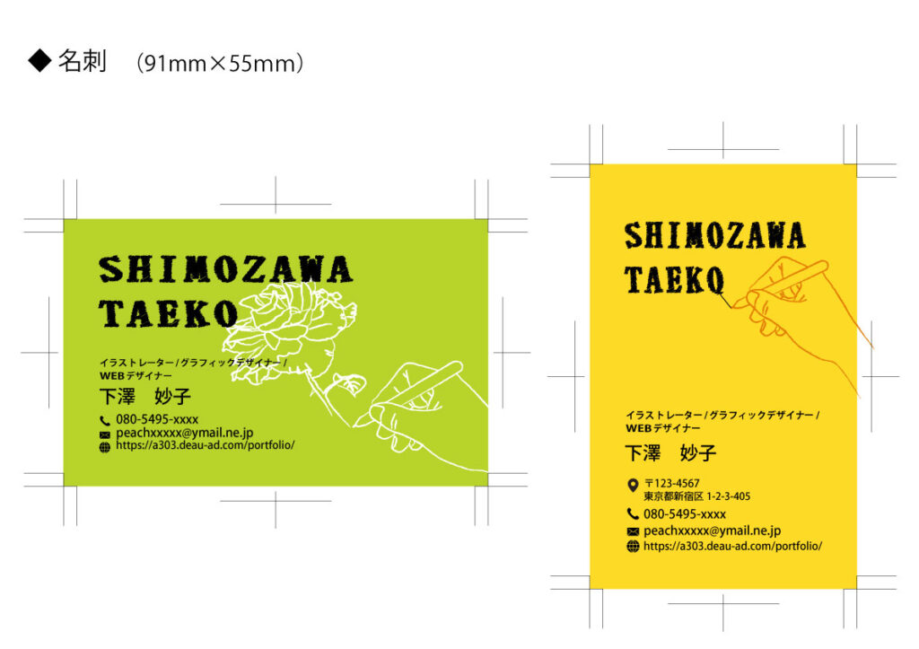 ③名刺 手描きを強調したもの、似顔絵入りのものなど。