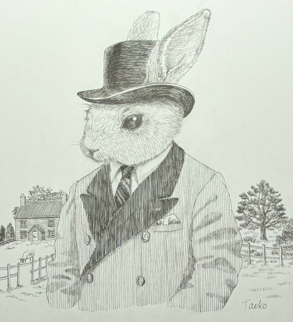 スーツを着てシルクハットをかぶったうさぎを描きました。バックにはイギリスの田舎の風景を入れてのどかな感じに仕上げました。