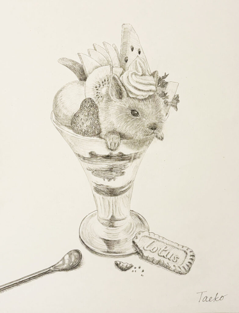 いつも描いているうさぎとは別の子を描きました。ビスケットをかじっていたら足音がしたので急いでフルーツパフェの中に隠れています。見つかってないと思っているみたいです。