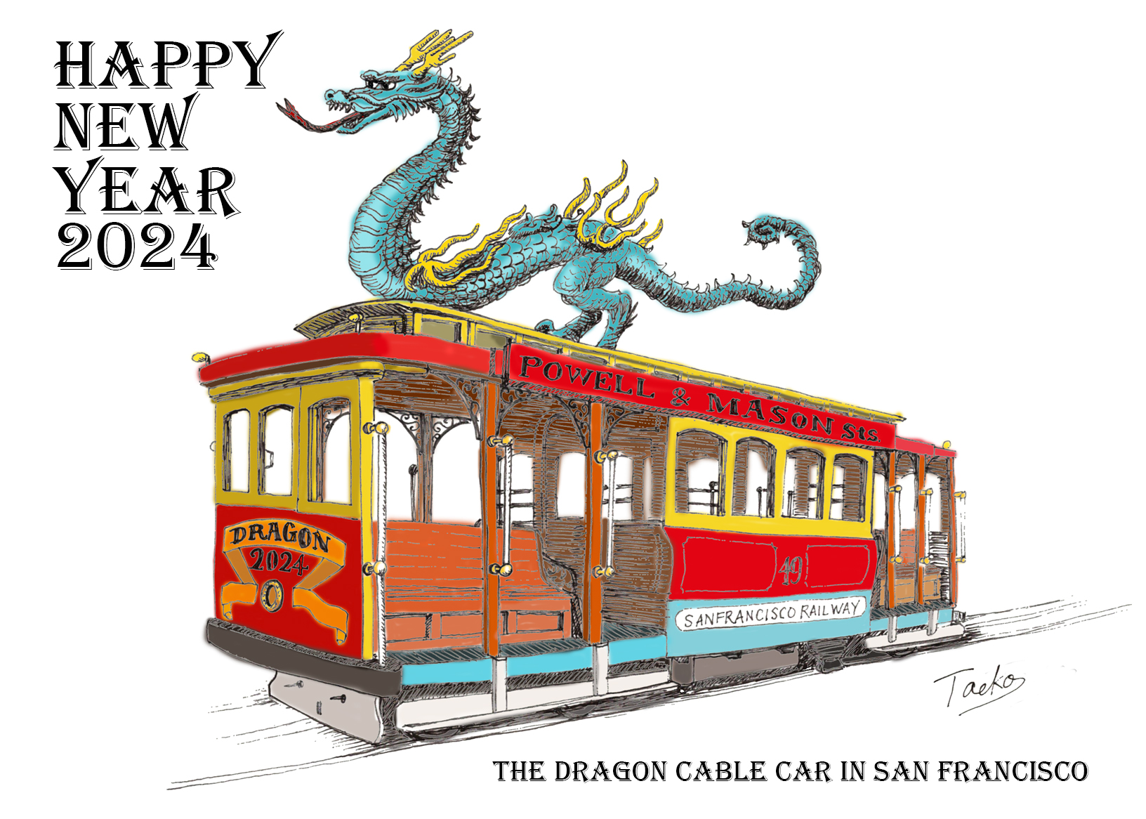 昨年サンフランシスコに行ったこともあり、年賀状用にケーブルカーと辰年のドラゴンを組み合わせて描き起こしました。