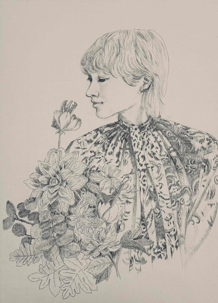 花が好きな優しい心の青年を描きました。
