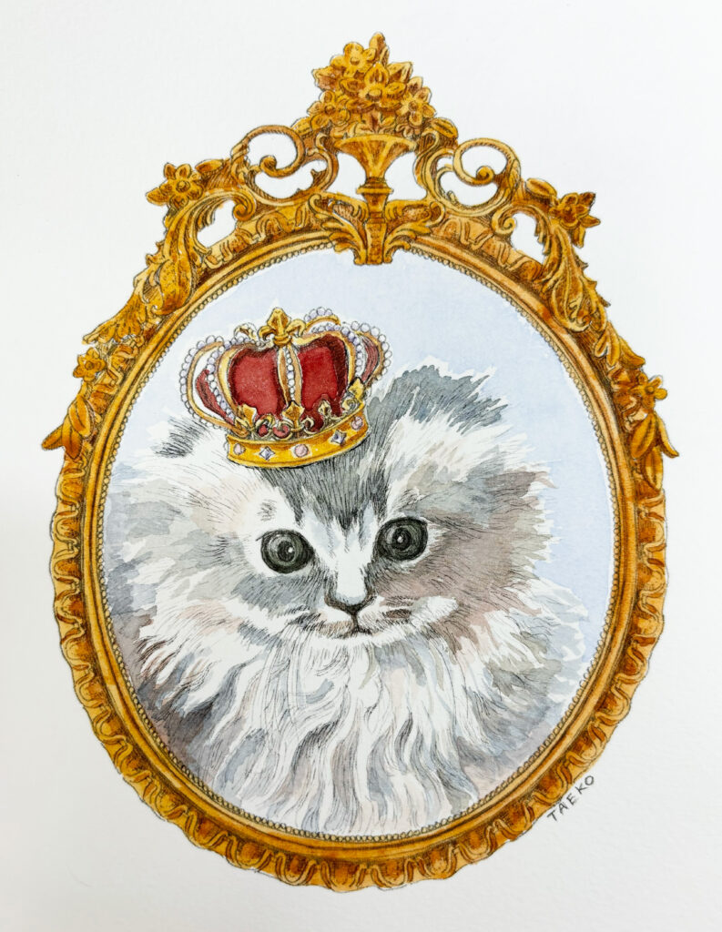 友人からの依頼で飼っている猫の絵を描きました。あどけなさが残る表情と豊かな長い毛で覆われた姿を表現。スコティッシュフォールドの中でもとても気品あふれる猫ちゃんだったので王冠をのせて王子様にしてみました。額縁も中世ヨーロッパ様式の彫刻が美しいデザインで描き起こし高級な雰囲気にしました。