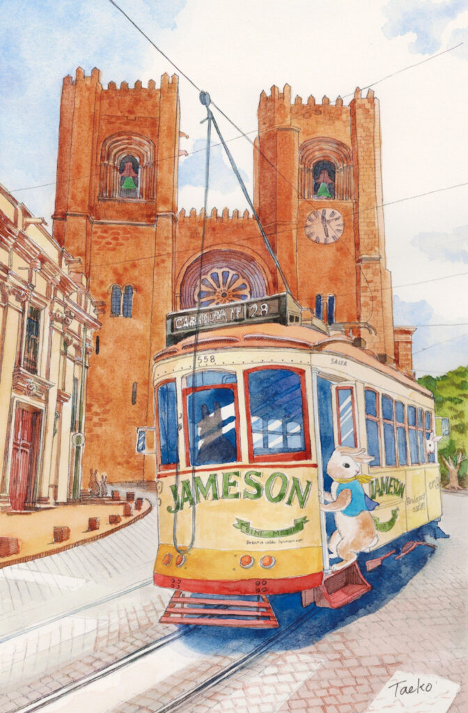 ポルトガル・リスボンの街を描きました。街中を走るカラフルで可愛いケーブルカーに飛び乗るうさぎとケーブルカーの窓から見つめるうさぎを登場させてストーリー性を持たせました。