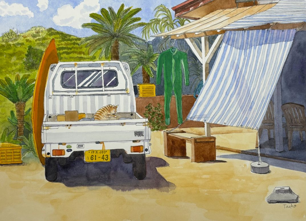 今年夏に行った島の海の家を描きました。実際にはこのような木や山などはなかったので描き足して、だいぶ南国の情緒あふれる島の家になりました。