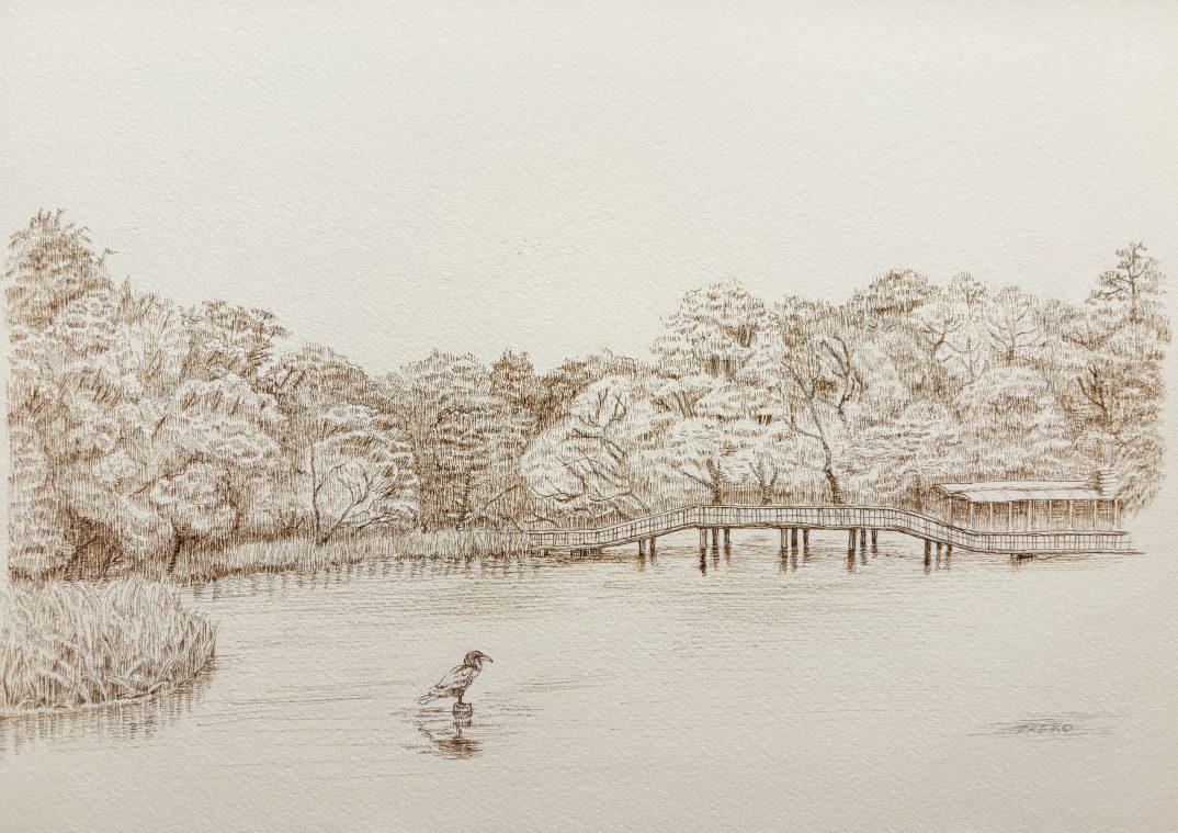 井の頭公園の森と池をペン画で仕上げました。多種ある木々を一つ一つペンで表現するのが楽しかったです。